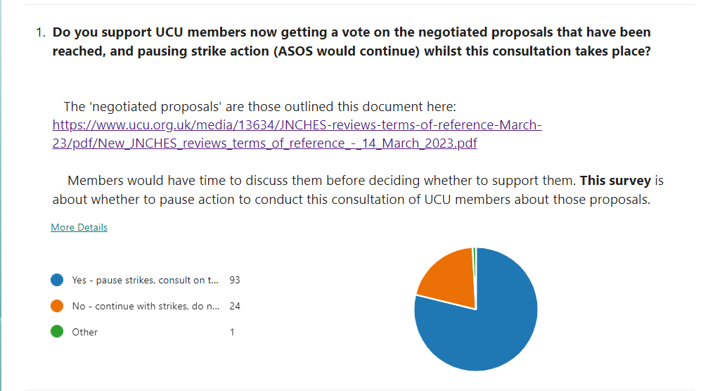 “Do you support UCU members now getting a vote on the negotiated proposals that have been reached, and pausing strike action (ASOS would continue) whilst this consultation takes place?” Yes/No